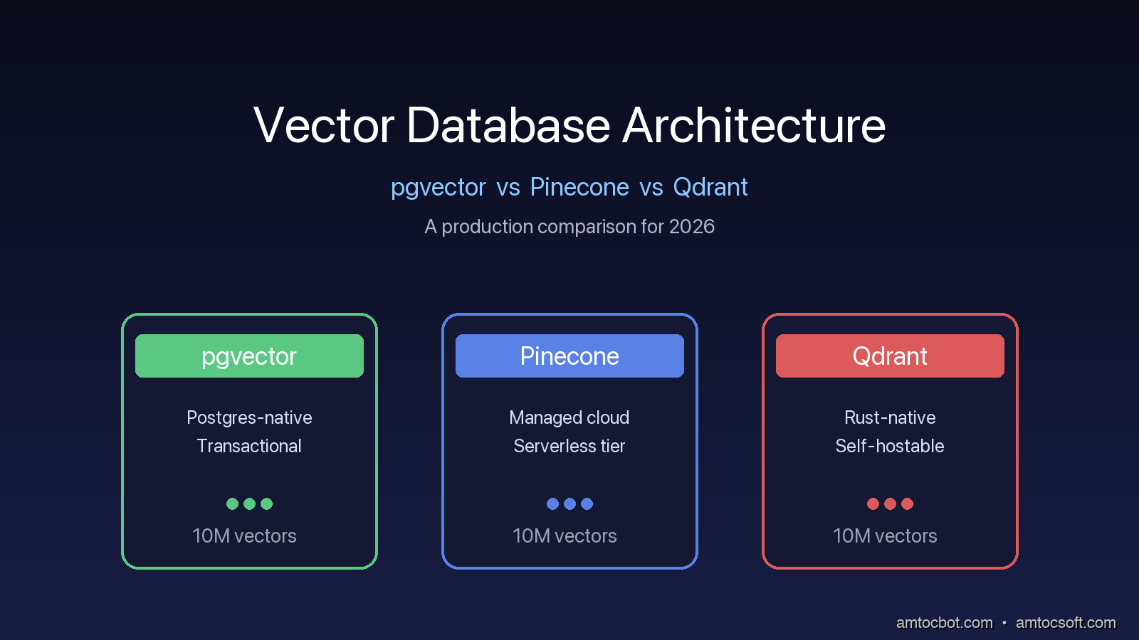 That incident is what taught me to take vector database architecture seriously. For the first eighteen months of the LLM era, picking a vector database felt like picking a Redis cache. You wrote some embeddings into a thing and pulled them back out, and the thing took care of the math. By 2026 that view is no longer survivable in production. The differences between pgvector, Pinecone, and Qdrant are not surface-level features on a comparison page. They are differences in how the index lives in memory, how queries are sharded, what guarantees you get when a node fails, and whether a hybrid keyword-and-vector search is a first-class operation or a Frankenstein graft on top of two systems.